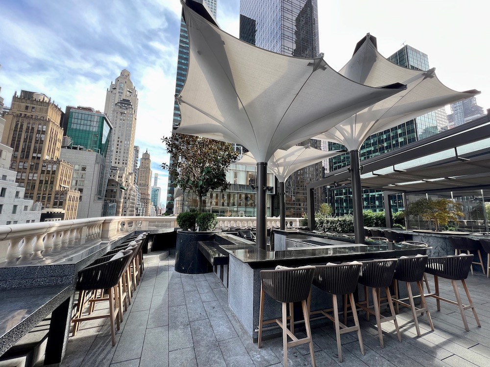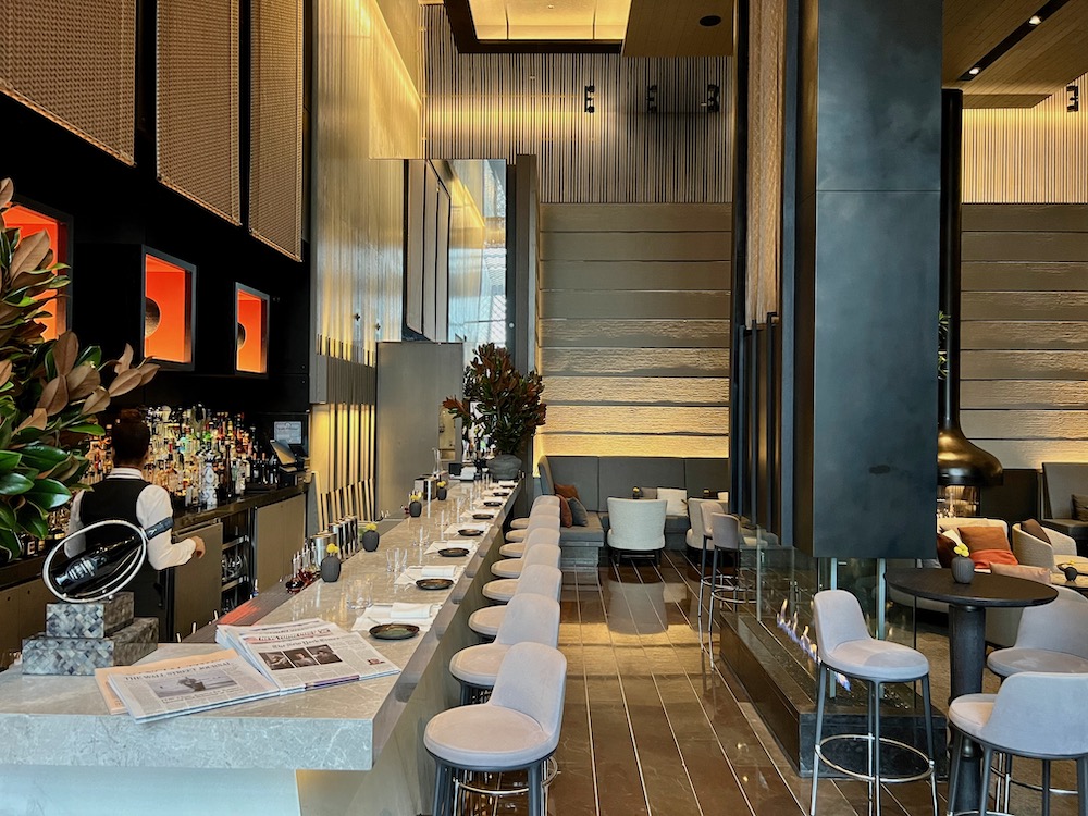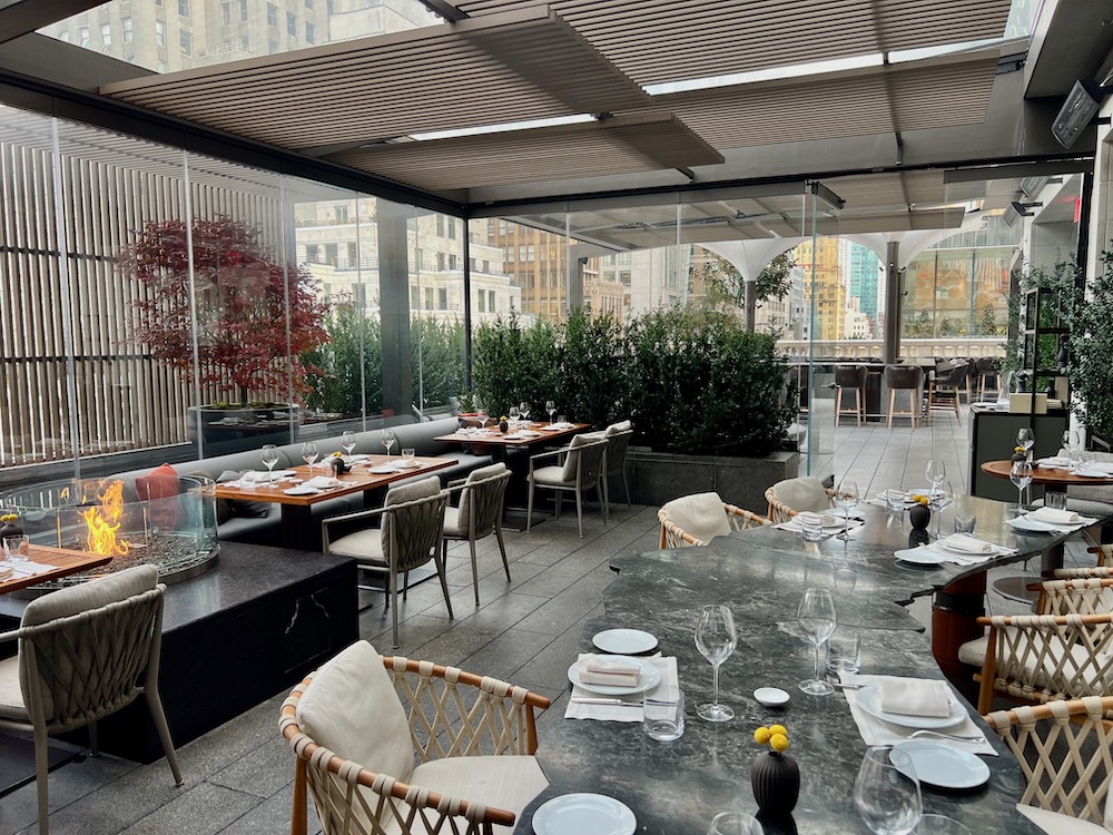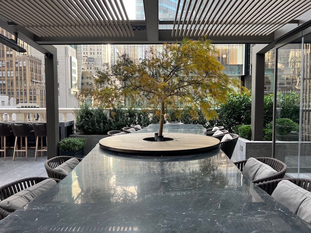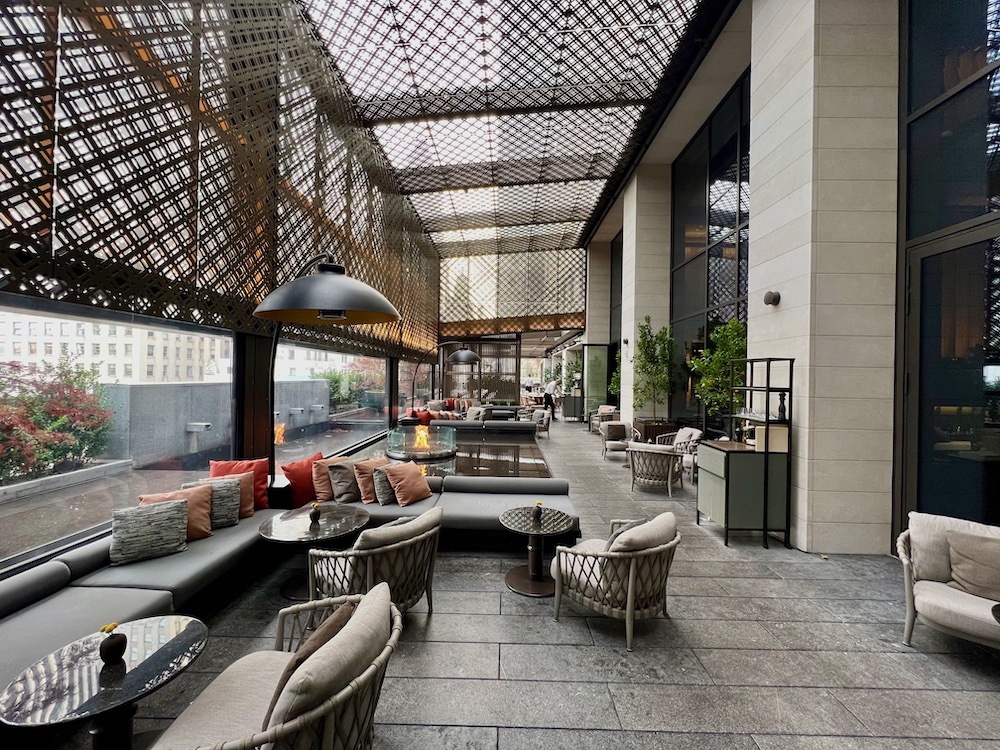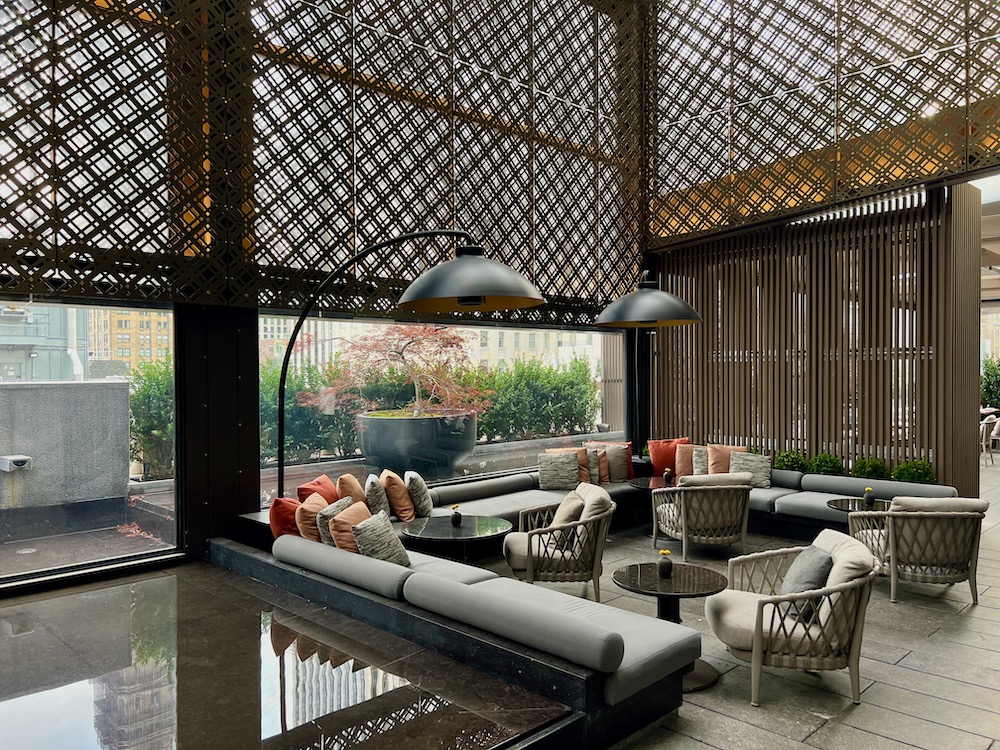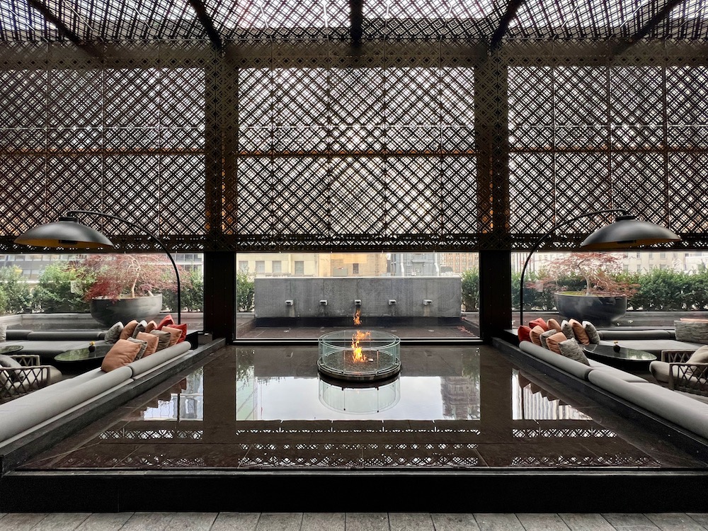 - The arrival experience at Aman New York sets the tone for an aesthetical and transformative journey which honors the Crown Building’s gilded and historic splendor. Behind a rather unremarkable and discrete entrance lies the hotel’s intimate ground floor lobby, whose purposefully dark design exudes luxury and privacy, transporting guests away from the frenetic pace of Manhattan. From here, two elevators go the hotel’s 14th floor, where a double-height atrium instantly instils a sense of grandeur, featuring some subtle Asian influences in tribute to Aman’s Asian roots. Featuring a graceful floral-inspired ceiling installation made from recycled cardboard, the atrium is home to a chic bar and several lounge areas which are arranged around a couple of gas fireplaces. The monumental space also connects to Aman New York’s two restaurants (more on that below) as well as a magnificent wraparound outdoor terrace. The latter features a reflective pool with a dramatic firepit at its centers and benefits from a retracting glass roof allowing year-round access. A corner bar adds to the terrace’s allure, offering spectacular views of the iconic crossroads of Fifth Avenue and 57th Street.