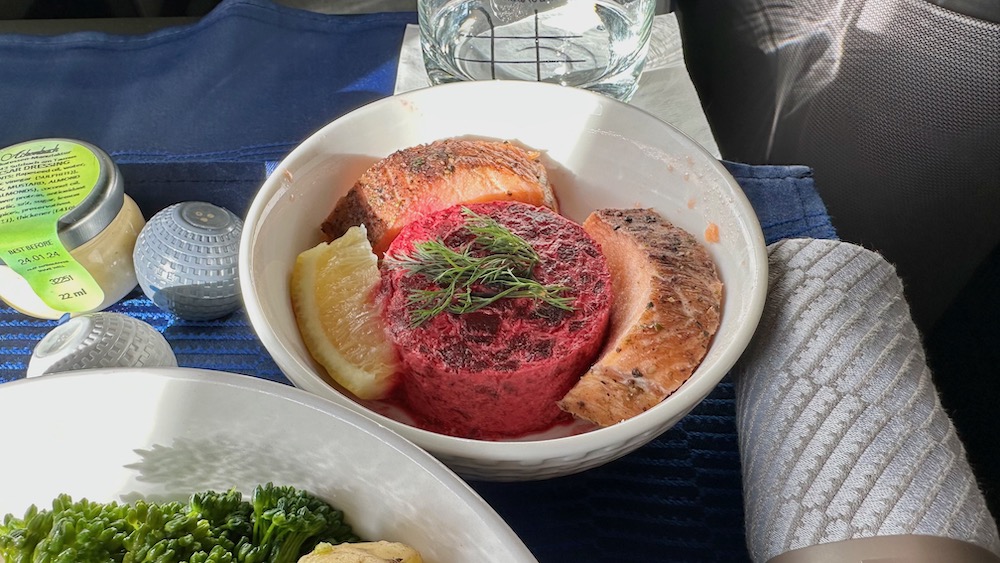 IMHO, the food was just ok for a Transatlantic flight. I was surprised (and a bit disappointed) that the starter, salad and main course were all served at once on one tray (although that may be to liking of those passengers who are fans of an express meal service).