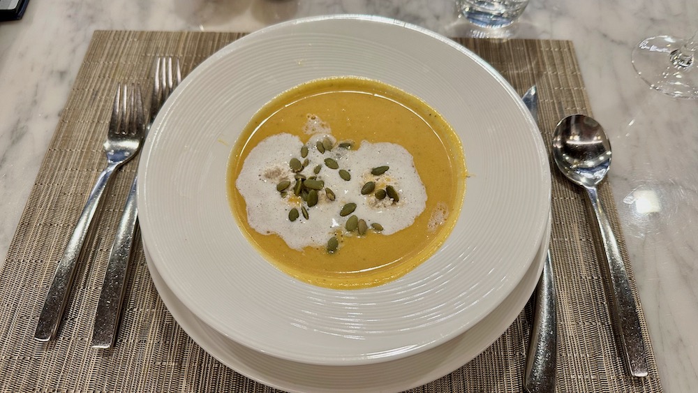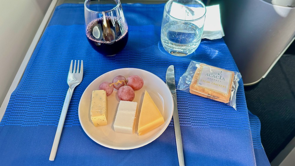 During the flight, several snacks were on display in the galley, including sweet & savory snacks, fresh fruits, and grilled cheese toasties. One could also order sweet potato-cocout soup.