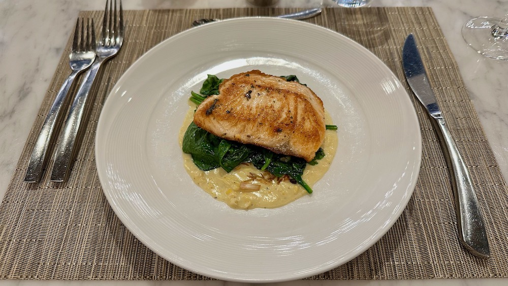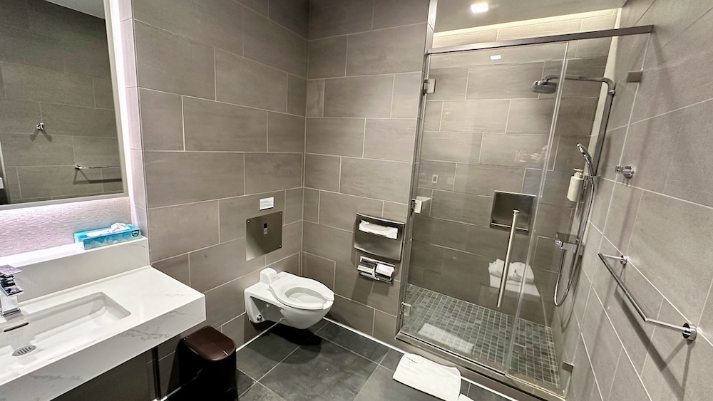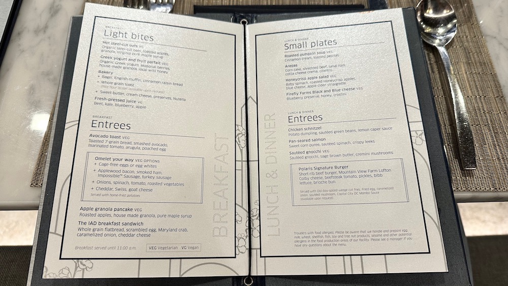After my arrival at Washington Dulles Airport, I spent a few hours in the Polaris Lounge while waiting for my connecting flight to New York. Located near gate C17 and open daily from 5:30AM until 10PM, the 21,000 square foot facility boasts the third-largest United Polaris Lounge in the airline’s network and is meticulously designed with detail and style in mind. Features of the United Polaris Lounge include 355 seats (including 42 pre-flight dining seats), 13 gender-neutral bathrooms, 6 spa-like shower suites with premium Sunday Riley health and beauty products, and suite-like rest spaces with Saks Fifth Avenue bedding. The lounge features a library where guests can enjoy a Washington DC-inspired decor, a bar area with a coffered ceiling, and a dining room behind lattice pocket doors (with a choice between à la carte dining or a buffet selection).