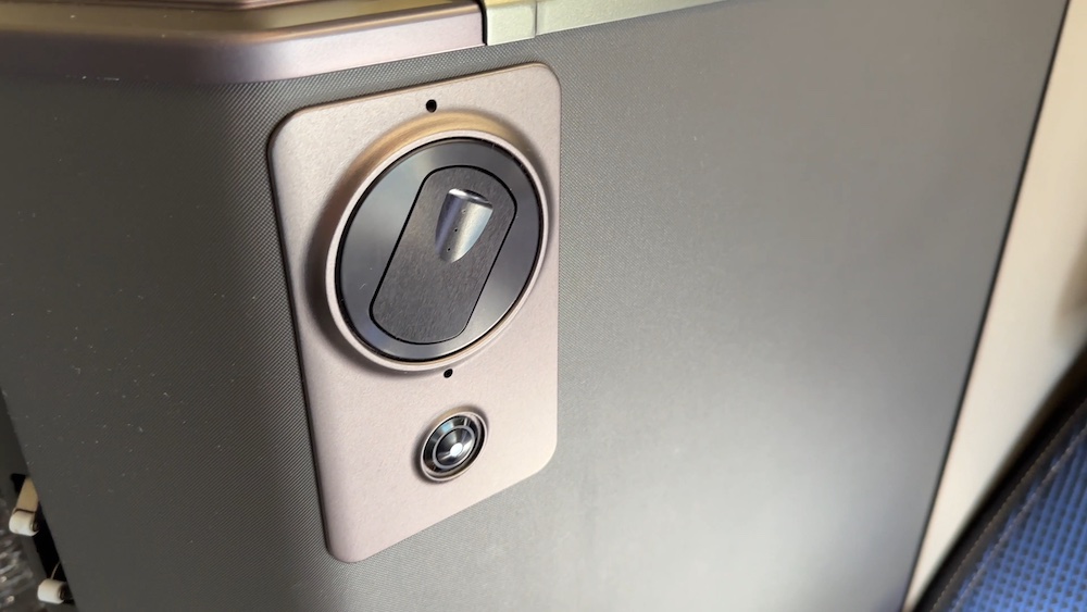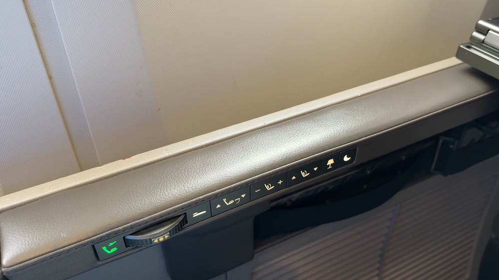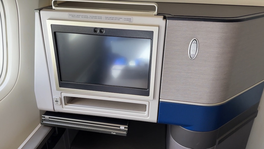 Right in front of each seat is a 16 inch HD entertainment screen, which can be controlled by a wired handset or by directly touching the screen. Right underneath the TV is a drawer (which is large enough to store a laptop) and an ottoman or footrest which becomes part of the flatbed when the seat is fully reclined.