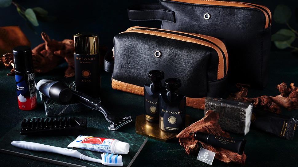 Emirates offers the most luxurious Business Class amenity kits in the skies, albeit only on longhaul overnight flights. The mammoth amenity kits are presented as two bag shapes, a pouch and classic toiletry bag silhouette, both made from vegan leather in a standout metallic silver shade with lilac accents. Contents of the female kit include a BVLGARI OMNIA Amethyste Eau de Toilette, Omnia Amethyste face and body emulsions, a lip balm, dental kit, deodorant, tissues, foldaway hairbrush and a double mirror made from a sustainable wheat straw material. Meanwhile the male kits comes in black fabric and features a BVLGARI POUR HOMME Eau de Toilette, a Bulgari after shave balm and body emulsion, a Gillette razor, shaving foam, dental kit, deodorant, tissues and foldaway hairbrush.