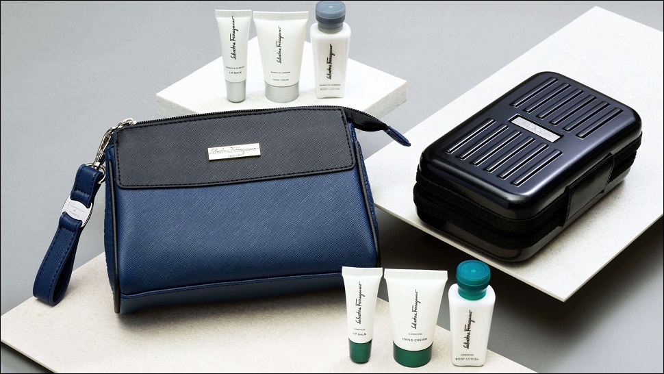 Taiwan-based carrier EVA Air also teamed up with Italian luxury brand Ferragamo to create the amenity kits for its Business Class passengers on long-haul flights. The hard-case amenity kits in classically elegant black are available to all Business Class passengers, departing from Taiwan’s Taoyuan International Airport on long-haul flights. Contents include a color-coordinated eye mask, cozy socks, a hairbrush, a microfiber cloth for cleaning glasses and screens on personal devices, earplugs, a toothbrush and toothpaste and skincare essentials. Returning to Taipei on these flights, EVA Air is providing Ferragamo soft-bag amenity kits in an eye-catching design, blending Taiwan’s aboriginal rhombus totems with stylish western cultural elements. The soft-sided bags were created to acquaint EVA’s passengers from around the globe with Taiwan’s art and culture.
