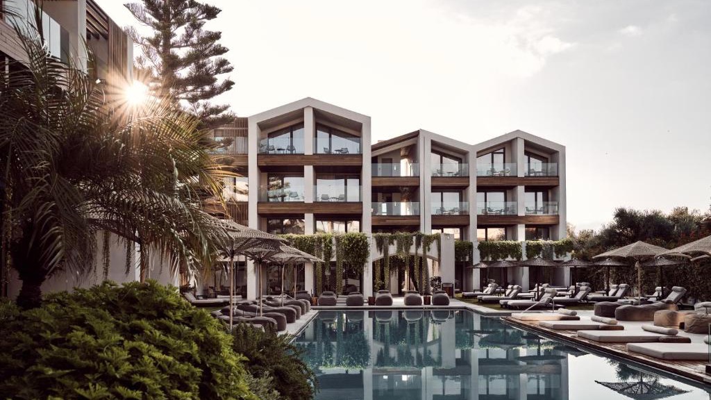 On the northeastern coast of Zakynthos, Olea All Suite Hotel frames natural beauty from an elevated hillside location, with tropical-modernist structures that face the sea and the countryside. Sunset terraces, communal lounges, and 93 luxurious suites appear to float on streams that meander around a lake-like pool in the resort’s heart. Natural materials such as oak, bamboo, and rattan characterize the furnishings and interior design elements, contrasting the cool geometric form and smooth interior surfaces of the buildings. Throughout the suites and communal areas, earthtone colors abound while an ambient lighting concept encourages relaxation. Guests can expect such treats as Olea’s spa with hammam, deep relaxation treatments, and yoga pavilion, Mediterranean and modern Greek cuisine, and fine wines around every corner. This hotel is adults only, 13 years and older friendly.