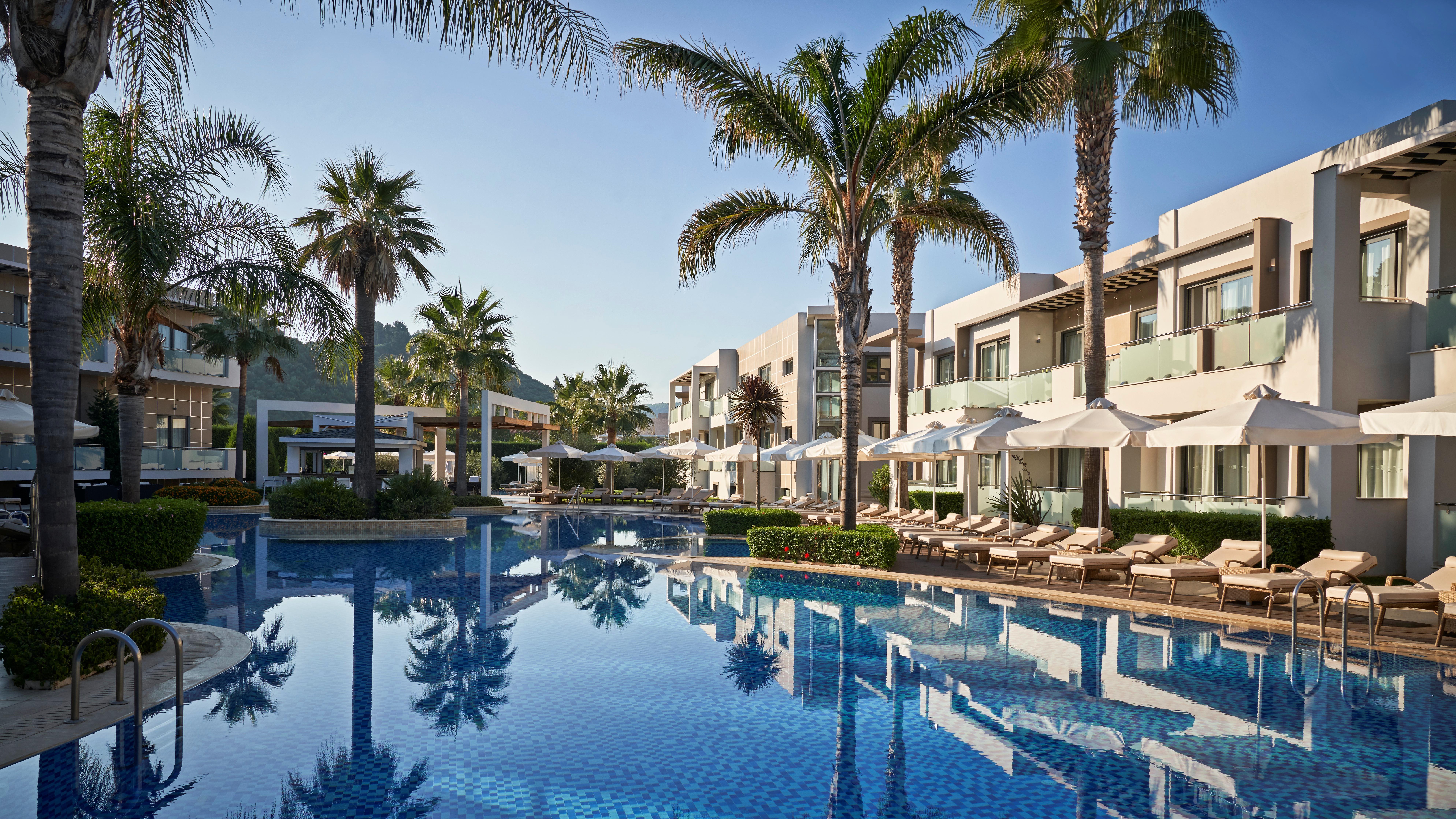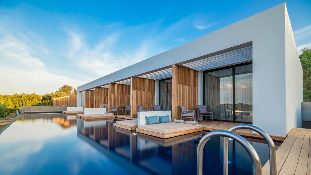 With over five miles (8 km) of beach on its doorstep, Golden Sun Resort promises a relaxing adults-only getaway. The boutique hotel is just a minutes’ walk away from Kalamaki’s long sandy strip, and the laidback tavernas and restaurants in the center of town can be reached within five minutes on foot, too. The property has 20 modern rooms: 16 luxury rooms with a private pool and four high floor rooms with a private Jacuzzi (each room accommodating two adults). The onsite restaurant is open for breakfast and dinner, and snacks are served throughout the day at the pool bar. The pool itself has a whirlpool bath by its side, and there’s also another swimming spot indoors at the spa, which also features a haman and Jacuzzi.