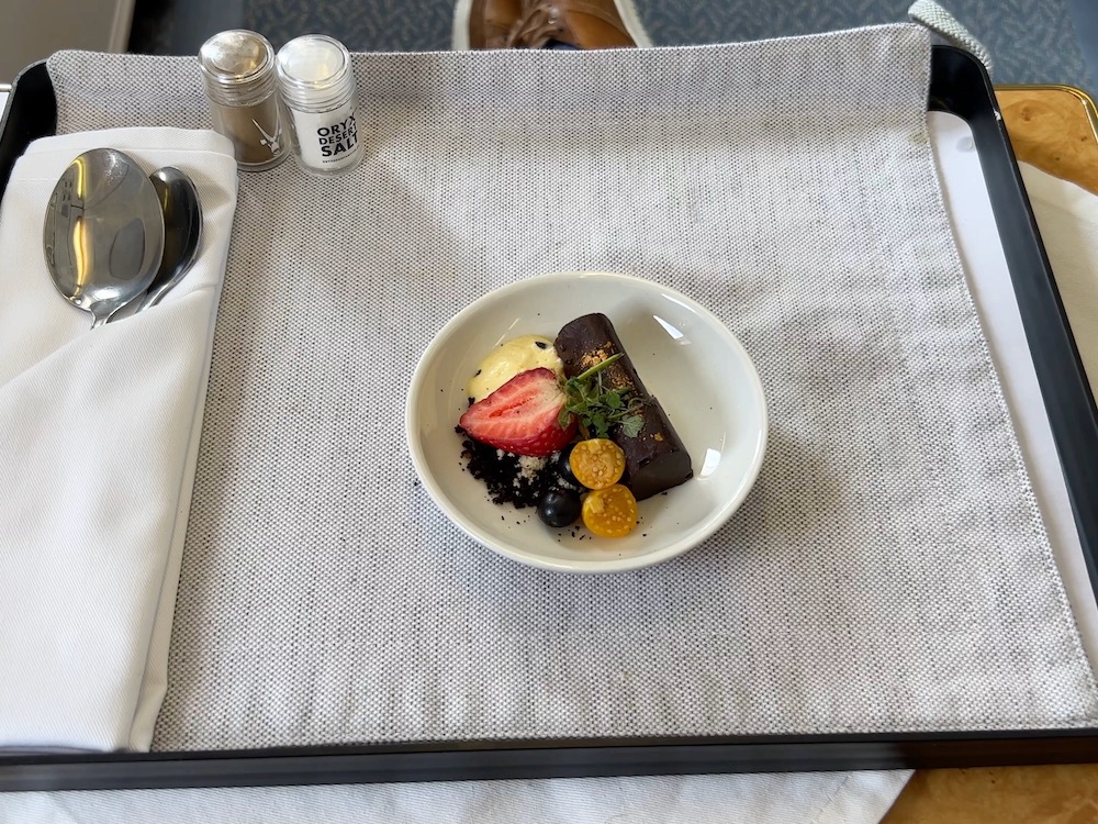 DESSERTAfter dinner, it was time for a nap. The angled lie-flat First Class seat allowed a recline to a near 180 degrees, and the Hi Fly cabin crew provided a pillow and blanket.