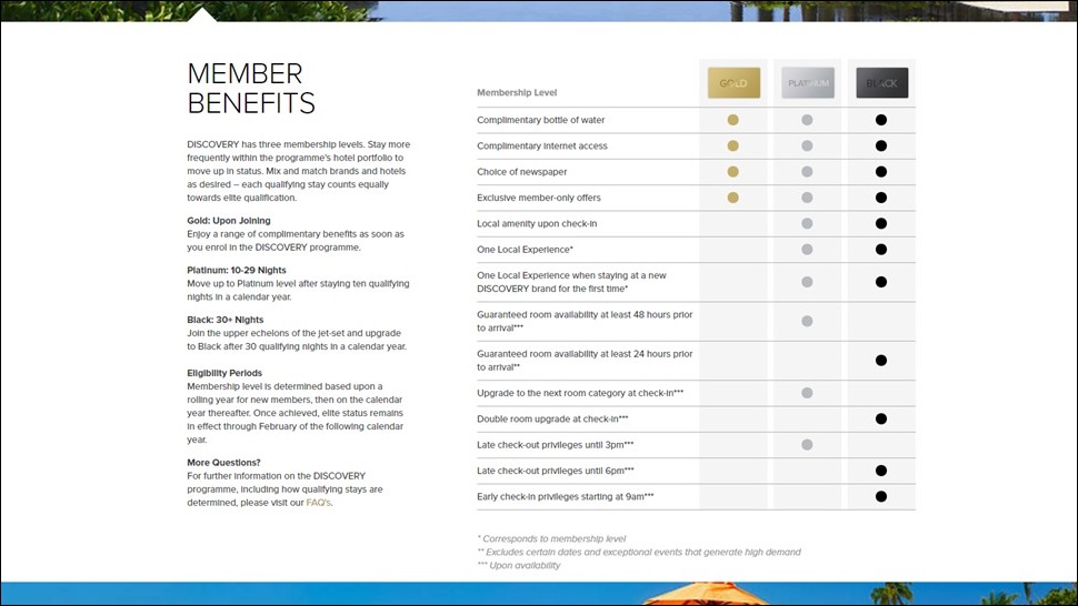 - Black membership, DISCOVERY’s highest level, is awarded to members with more than 30 room nights in a calendar year. In addition to the benefits of Gold members, Black members also receive the following benefits: